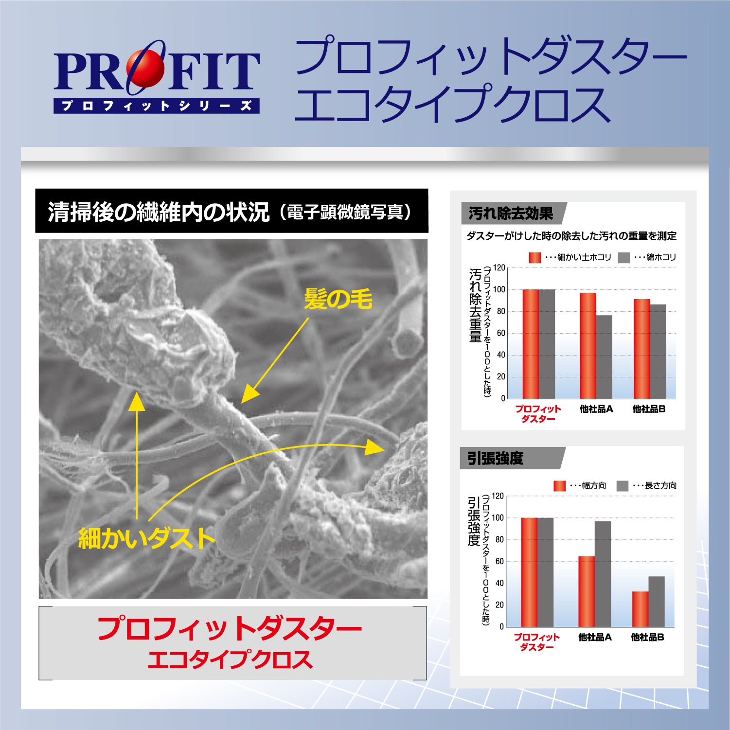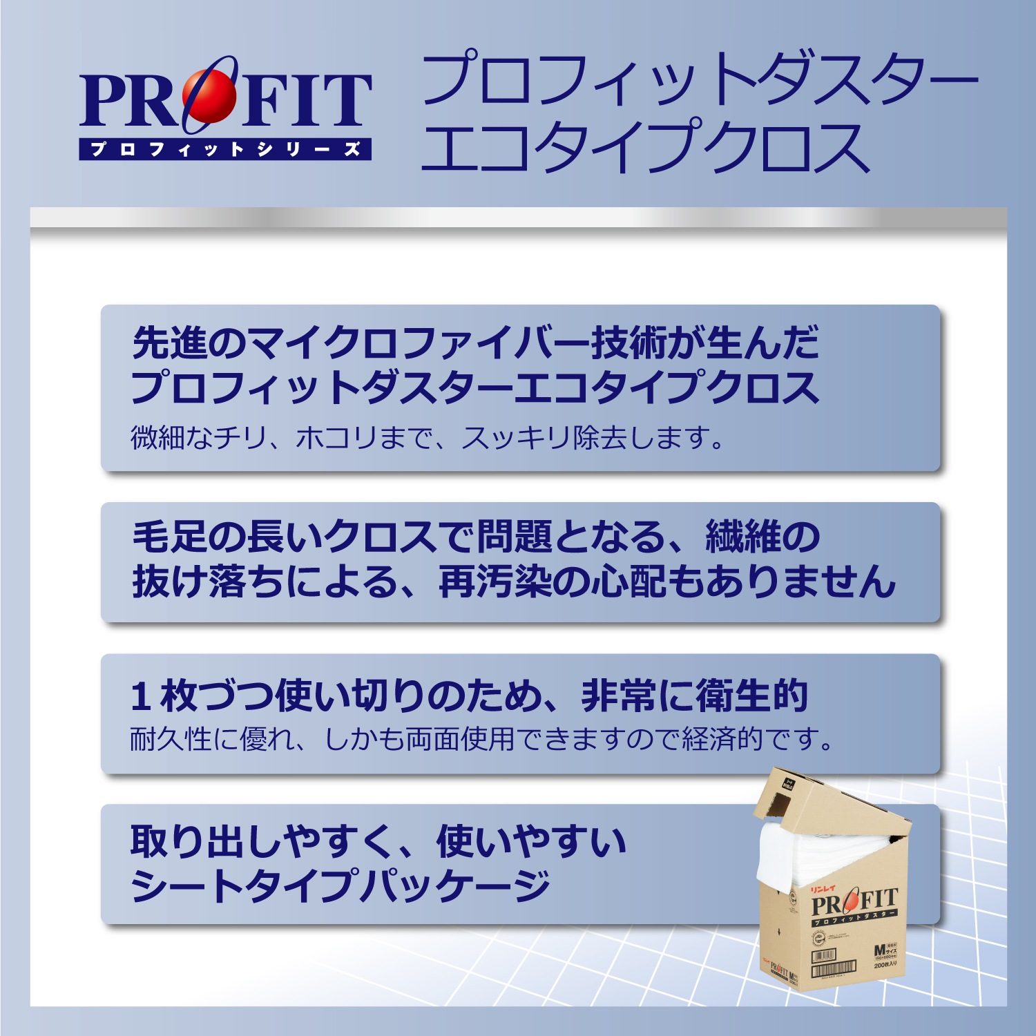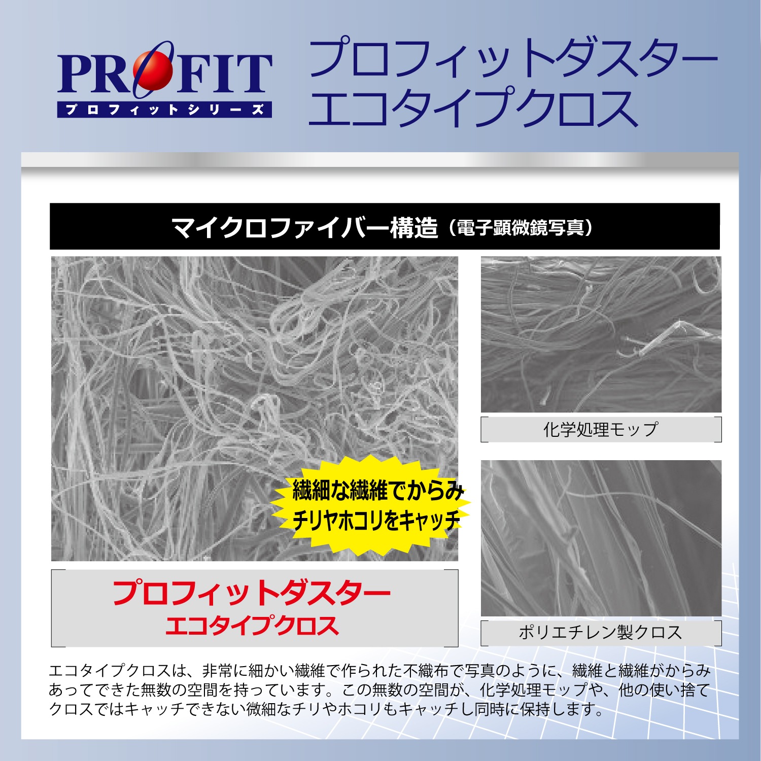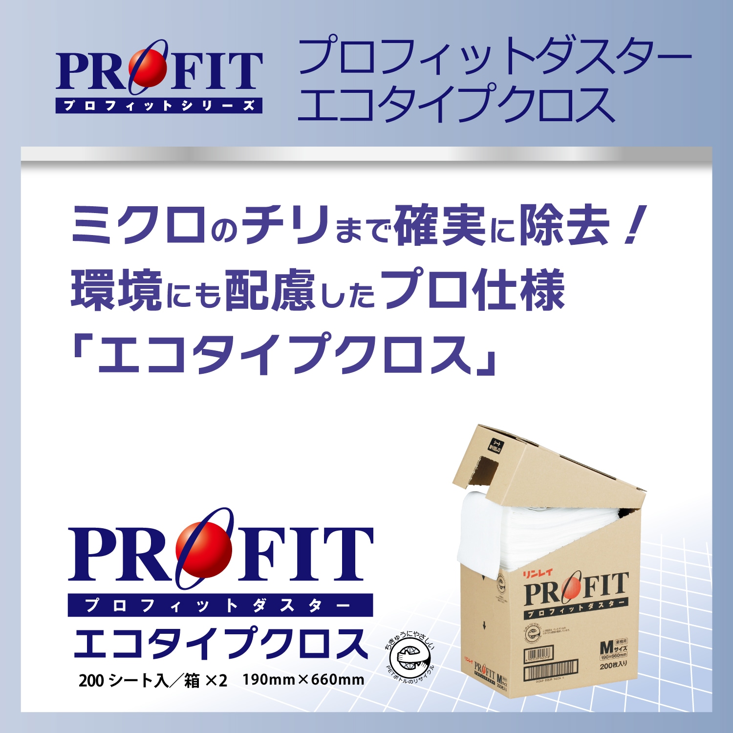 「ミクロ」のチリまで確実に除去、環境にも配慮したプロ仕様「エコタイプクロス」 ・微細なチリ、ホコリまですっきり除去。 ・毛足の長いクロスで問題となる、繊維の抜け毛による再汚染の必要もありません。 ・1枚使いきりのため、非常に衛生的。 ・取り出しやすく、使いやすいシートタイプパッケージ。 ※エコタイプクロスは<環境に優しいエコマーク認定商品です>
